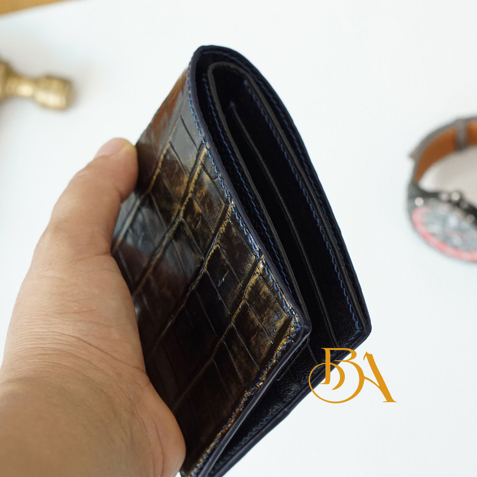 * PREMIUM QUALITY LEATHER: Indulge in luxury with our leather wallet, crafted from premium top leather. We utilize exquisite Alligator leather and Alran Sully Goat leather, known for their superior quality and durability.